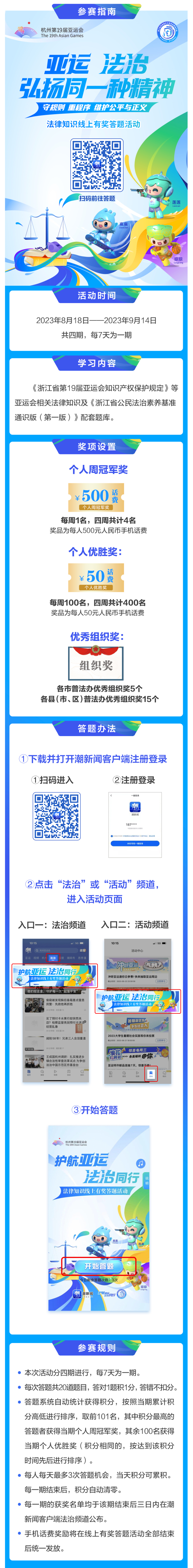亞運(yùn)法律知識線上有獎答題活動已于8月18日在“潮新聞”客戶端正式開啟,具體情況如下: